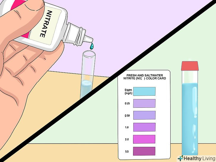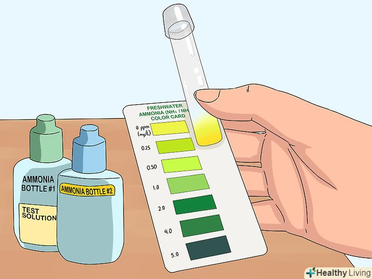 Перевірте рівень аміаку та нітритів за допомогою набору. після додавання в воду нашатирного спирту протягом декількох днів почніть вимірювати рівень нітритів і аміаку. [11] візьміть з акваріума дві проби води за допомогою прикладених до набору піпеток. Після цього струсіть розчин для вимірювання рівня аміаку і додайте в піпетку з водою вказане на пляшці кількість крапель. Потім струсіть розчин для вимірювання рівня нітритів і додайте в другу піпетку вказане на пляшці кількість крапель. І нарешті, порівняйте колір води в тестових піпетках з прикладеною до набору таблицею кольорів, щоб визначити концентрацію аміаку і нітритів в акваріумний воді. [12]