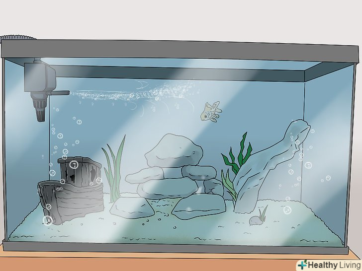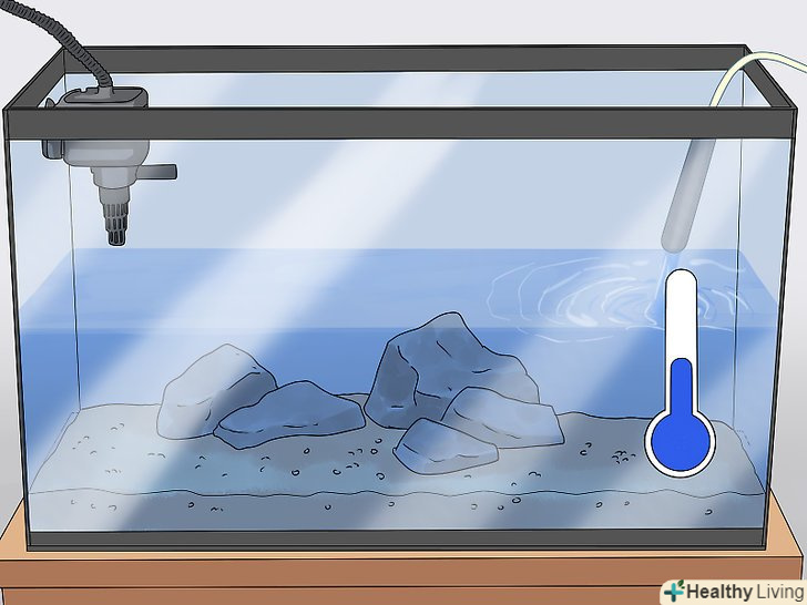 Розмістіть Акваріум у відповідному місці, куди потрапляє трохи природного сонячного світла. знайдіть місце поблизу джерел електроенергії та води. На акваріум має потрапляти деяка кількість сонячного світла, проте не ставте його біля освітлюваного сонцем вікна, інакше він може перегрітися. [2]- Якщо ви не займаєтеся розведенням золотих рибок, підтримуйте постійну температуру 23 °C.