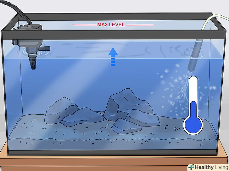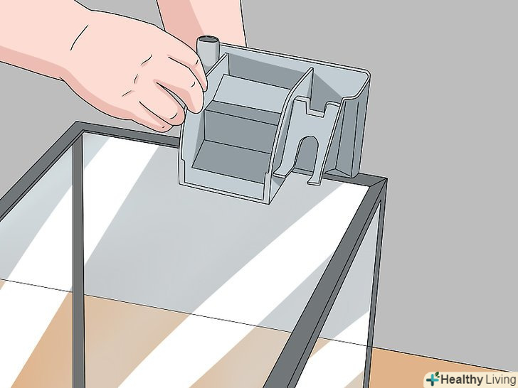 До кінця заповніть Акваріум чистою водою. залийте у відро чисту холодну воду. Перелийте її в акваріум, щоб вона майже доходила до його верхнього краю. [8]- На даному етапі можна відрегулювати фільтрувальні труби. Наприклад, якщо у вас донний фільтр, простежте, щоб відвідні труби наполовину виступали з води.