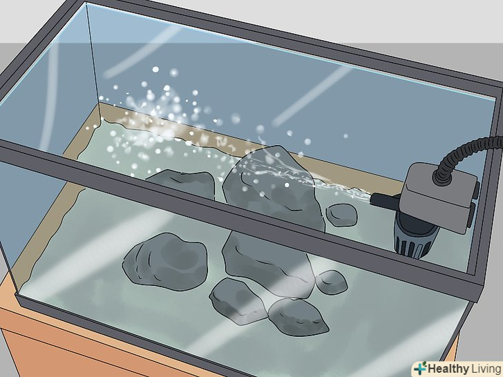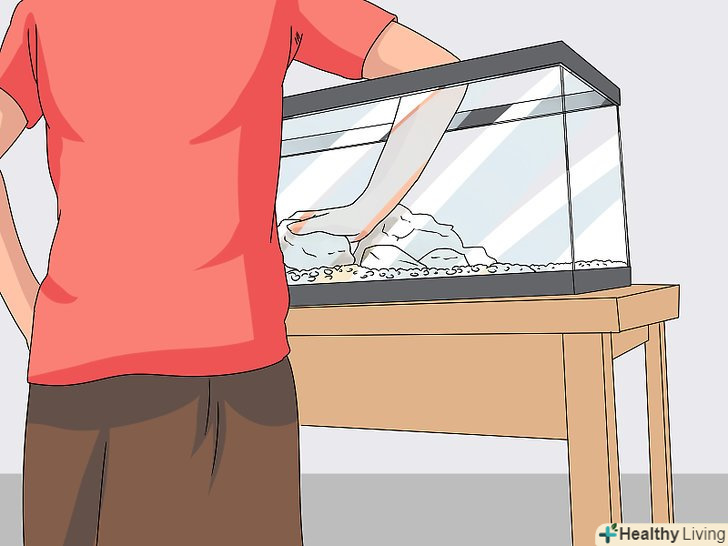 Прикрасьте Акваріум камінням та іншими декораціями. виберіть в магазині для акваріумістів кілька різнокольорових каменів (підійде сланець або червоний сланець). Покладіть камені поверх гравію. Якщо у вас є інші декорації, їх також можна помістити в акваріум на даному етапі. [7]