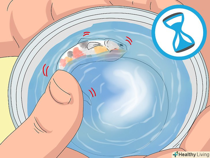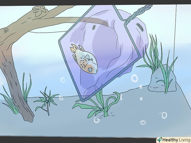 Якщо є можливість, приберіть загиблу рибу з акваріума. за допомогою сачка відловіть мертву рибку. Якщо вам не вдається знайти її тіло, не переживайте. Саме по собі тіло однієї загиблої рибки не зашкодить іншим рибам і розкладеться природним чином.- Рибним паразитам і захворюванням потрібен живий носій. Якщо ви підозрюєте, що рибка загинула від захворювання, то її сусіди по акваріуму можуть бути вже заражені. Слідкуйте за появою у них симптомів захворювання. Якщо ж риби не захворіють і у них не з'явиться ніяких несприятливих симптомів через кілька днів, то можна вважати, що вони виявилися досить сильними, щоб перебороти хворобу. [6]