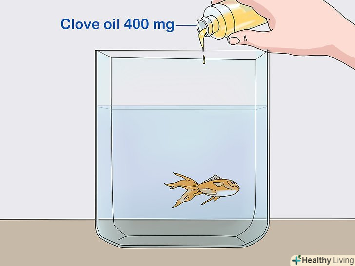 Приспайте відчуває страждання рибку. гвоздична олія є седативним засобом, за допомогою якого можна найбільш гуманно припинити страждання вмираючої риби. Гвоздичне масло продається в більшості аптек. Відсадіть гине рибку в окрему ємність, наповнену одним літром води. Додайте у воду 400 мг гвоздичної олії. Протягом 10 хвилин у риби закінчиться кисень і вона мирно помре. [5]