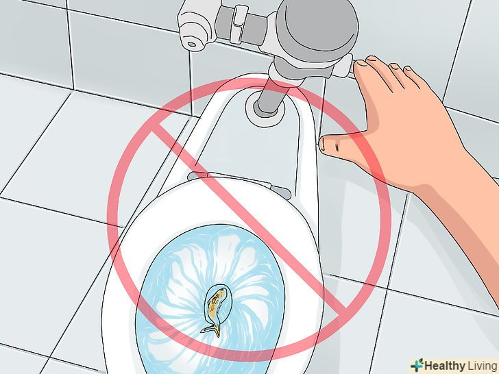 Не змивайте мертвих риб в каналізацію, якщо стічні води виходять у водойми. навіть мертва рибка, що потрапила в нерідну для себе середовище проживання може завдати шкоди природним мешканцям водойми. Викиньте тіло рибки в сміття або закопайте його в землю. При цьому, якщо риба досить велика, найкраще саме закопати її. Проте, вам не завадить ознайомиться з місцевим законодавством на предмет того, чи дозволені такі дії з Вашого боку. [7]