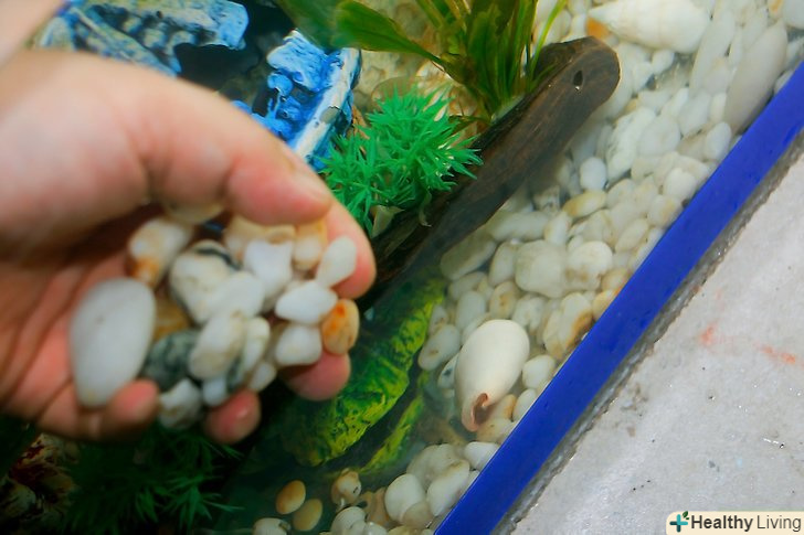 Додайте гравій. дрібний гравій є для золотих рибок найбільш підходящим, так як його закруглені краї не можуть пошкодити рот риб. Перед додаванням гравію, заповніть Акваріум водопровідною водою, на глибину шару гравію, а потім додайте субстрат.