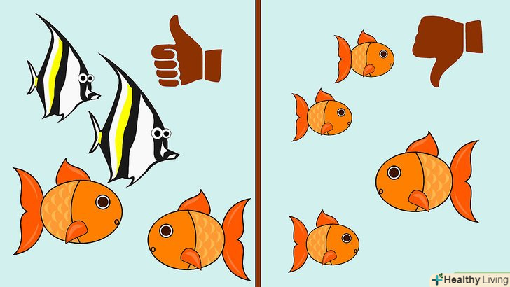Запустіть рибку в акваріум. якщо у вас кілька золотих рибок, бажано, щоб вони належали до одного виду. На жаль, золоті рибки іноді поїдають своїх дрібніших родичів або можуть переїдати, відбираючи у них корм. Якщо одна з рибок помітно дрібніше або повільніше інших, у неї немає шансів. Можна відокремити "забіяку" або більш слабку рибку від родичів за допомогою наявних у продажу акваріумних роздільників.- Золоті рибки можуть прекрасно уживатися в одному акваріумі, однак для цього слід ретельно підбирати "компанію". Хорошим вибором є кардинали або даніо-реріо, а також плекостомуси. однак