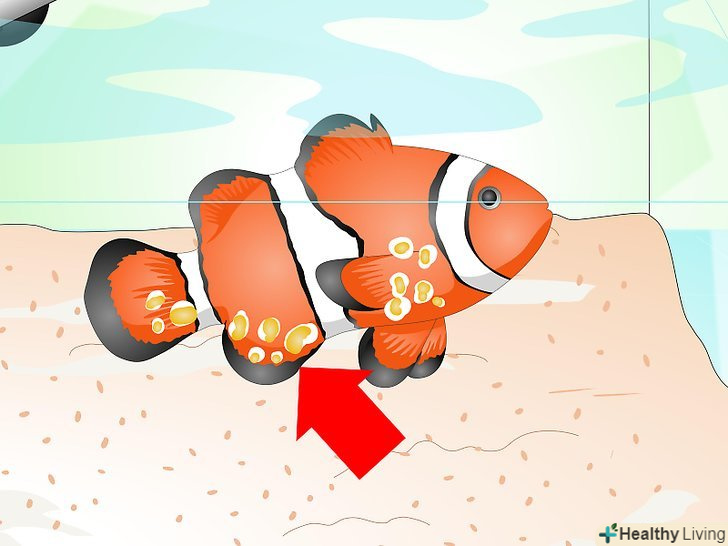 Виявіть зараження паразитами. при зараженні внутрішніми паразитами рибка може мати нормальний апетит, але при цьому втрачати вагу. Про хворобу свідчить також мляве поведінку.- Іхтіофтіріоз ("манка"). Дане захворювання викликається паразитами і проявляється у вигляді білих точок по всьому тілу і голові рибки, які нагадують манну крупу або сіль. Воно може супроводжуватися нерухомістю плавників.