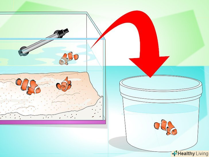 Відокремте хвору рибку від інших мешканців акваріума. перемістіть хвору рибку в окрему ємність або акваріум, щоб від неї не заразилися інші рибки. Крім того, так буде простіше давати їй ліки. При цьому використовуйте воду з основного акваріума, щоб рибка не зазнала стрес.