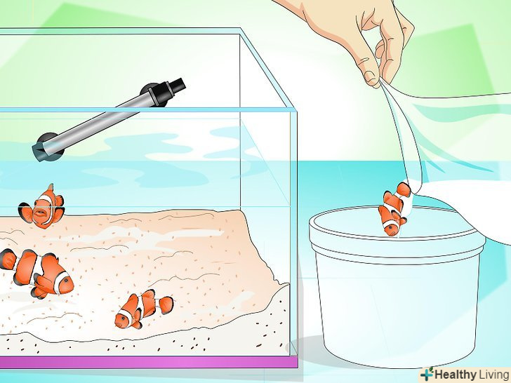 - Помістіть в акваріум кульок. Через 30 хвилин додайте в кульок ¼ склянки (60 мілілітрів) акваріумної води. Додавайте таку кількість води кожні 15 хвилин протягом години. Якщо кульок переповниться, просто злийте зайву воду. Після цього зловіть рибку сачком і перенесіть її в кульку в новий акваріум.