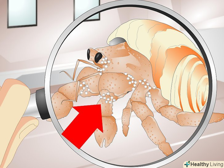 Перевірте, чи немає у Раку кліщів. кліщі є однією з найпоширеніших причин проблем зі здоров'ям у Раків-відлюдників, тому слід регулярно перевіряти, чи не з'явилися вони у ваших вихованців. [7] врахуйте, що на самих раках і в акваріумі можуть завестися як "хороші" (безпечні), так і "погані" (шкідливі) кліщі. [8] пошукайте наступні види шкідливих кліщів:- Зяброві кліщі. Ці світло-рожеві або червоні кліщі зариваються в зябра раків. Їх часто не видно до самої смерті рака-відлюдника, оскільки у живих раків зябра прикриті шкірної платівкою.