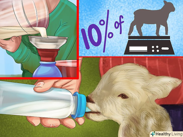 Підготуйте пляшку. ягняти слід годувати з пляшки об'ємом 250 мілілітрів з гумовою соскою.- Для початку слід налити в пляшку замінник молозива в кількості 10% від ваги ягняти і згодувати його тварині протягом 24 годин. Протягом цього часу намагайтеся годувати ягняти кожні дві години. [8]