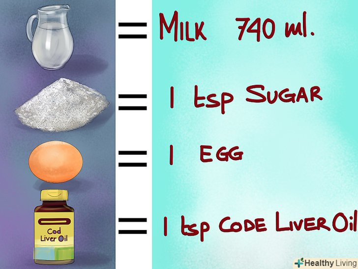 При необхідності приготуйте власну суміш. якщо вам не вдасться знайти замінник молока або молозива, можна приготувати суміш самостійно. Однак спочатку пошукайте суміш в магазинах, так як в стандартних замінниках містяться всі необхідні поживні речовини. Спробуйте приготувати суміш самостійно лише після того, як вам не вдасться купити її.- Щоб отримати замінник молозива, змішайте 740 мілілітрів коров'ячого молока, одне яйце, чайну ложку (5 мілілітрів) риб'ячого жиру і чайну ложку (5 мілілітрів) глюкози. Можна також приготувати суміш з 600 мілілітрів коров'ячого молока, чайної ложки (5 мілілітрів) касторової олії і одного яйця. [6]