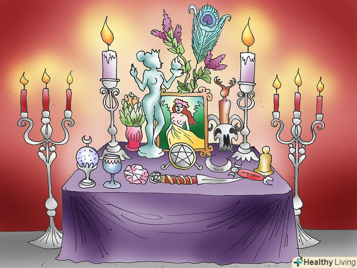 Спорудіть вівтар. Вівтар може бути простим, і древній череп буде вам не потрібен (хоча було б непогано). Вівтар-це місце, де ви будете працювати. На ньому повинні розташовуватися особисті амулети і речі, які допомагають вам творити і без яких ви не змогли б працювати. Це можуть бути кристали, камені, трави, зображення і будь-які інші предмети сили. Розмістіть всі ці предмети на вівтарі.- Якщо ви вікканец, вам можна розкласти на вівтарі лавр, засохлі квіти, сушені трави та інші природні речі. Знайдіть камені, з якими у вас буде зв'язок, черепашки або інші красиві предмети.
