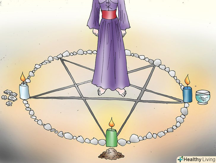 Окресліть коло. у різних традиціях по-різному чертится коло, але спосіб не має значення: можна використовувати свічки, камені, малювати лінії крейдою або викладати паличками. Коло-це фізичний і психологічний бар'єр, який відокремлює ваше робоче місце і який допомагає вам отримати всю необхідну силу і енергію для роботи.- У багатьох напрямках коло повинен включати в себе свічки, які відзначають 4 сторони світу. Можна також додати трохи кожного елемента всередині кола: Землі, води в склянці, вогню у формі свічки та інших елементів.