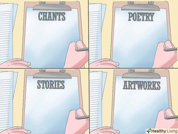 Включіть в книгу пісні, поеми, історії та малюнки, створені вами або кимось іншим. вони будуть служити вам джерелом натхнення, або ви можете присвятити їх вашому божеству.