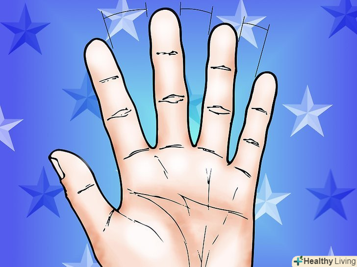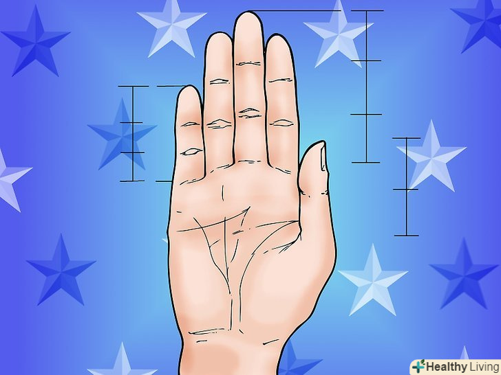 Виміряйте кожен окремий палець. вказівний і безіменний пальці порівнюються один з одним. Якщо вказівний палець хоч трохи більше, він вважається довгим. Безіменний палець повинен бути на 1 / 8 дюйма (1/2 см) довше, ніж вказівний палець, тоді він вважається довгим. Лінія, проведена між цими двома пальцями повинна доходити приблизно до половини останнього суглоба на середньому пальці. Якщо вона досягає вище половини, середній палець вважається довгим; якщо менше половини, він вважається коротким. Мізинець повинен досягти лінії суглоба на безіменному пальці. Якщо мізинець починається низько (перший суглоб заходить на відстань менше половини вниз від безіменного пальця), вам потрібно буде врахувати це при вимірюванні. Великий палець зазвичай вимірюється від вказівного пальця. Більшість пальців закінчуються між 1/4 і 1/2 до першої фаланги пальця.- Вказівний палець зазвичай вважається найважливішим в хіромантії. Його іноді називають "дзеркалом", так як він говорить про самооцінку людини.