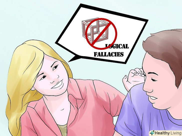 Уникайте логічних помилок і вкажіть на ті, які використовує ваш друг. обидві сторони будь-якої дискусії будуть часто створювати неправильну аргументацію і покладатися на риторику, навіть не помічаючи того. Загальні логічні помилки в релігійних дебатах включають:" жоден справжній шотландець ", "після цього-значить через це"," брехлива аналогія "і" Аргумент до незнання ".