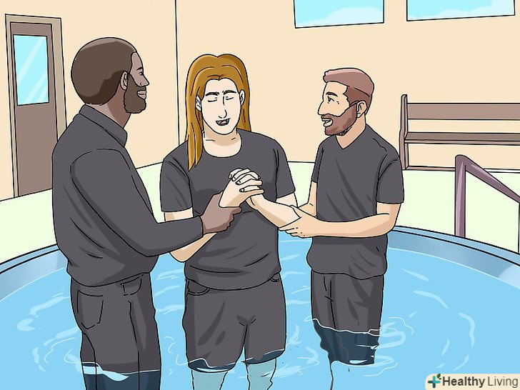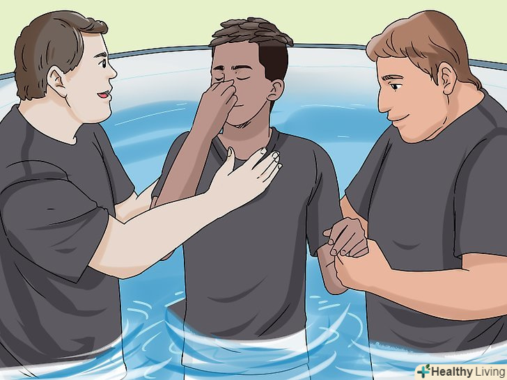 Підніміть людину з води. людини можна тримати під водою одну-дві секунди. Потім його потрібно підняти рукою, якою ви обхопили його ззаду. Вам потрібна буде його допомога. Коли ви будете піднімати крещаемого з води, він повинен буде сам постаратися встати. Якщо він цього не робить і починає тонути, обхопіть його обома руками під пахвами і підніміть його. [9]- Перед тим як крещаемий вийде з води, обійміть його. Це буде демонстрацією любові Христа і покаже, що ця людина стала членом Сім'ї Божої.