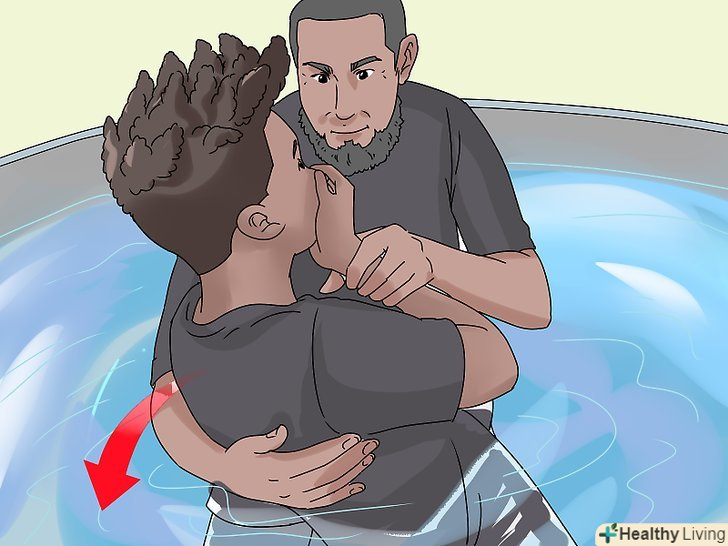 Покладіть одну руку на спину, а іншу спереду. коли будете готові занурити його під воду, обхопіть його однією рукою ззаду. Покладіть руку на спину або обхопіть його за плечі. Іншою рукою візьміться за руку, якою він затискає ніс, або покладіть її на його схрещені руки. [7]