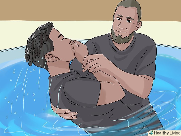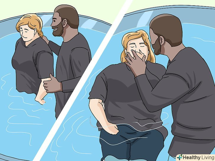 Перекиньте крещаемого назад і занурте його у воду. давнє розуміння хрещення має на увазі те, що людина повністю занурюється під воду і все його тіло покривається водою. Обережно перекиньте людини назад і занурте його під воду так, щоб все його тіло виявилося під водою. Якщо людина невисокого зросту, його ноги можуть відірватися від дна, коли його повністю занурять у воду. [8]- Ви можете запропонувати людині зігнути ноги в колінах, якщо вам обом так буде зручніше.