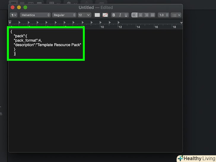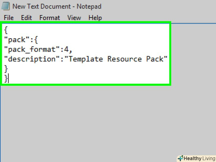Введіть код ресурс пака.у створеному текстовому документі введіть наступний код-кожен рядок коду повинен знаходиться на окремому рядку:{"pack":{"pack_format":4,"description":"Template Resource Pack"}}