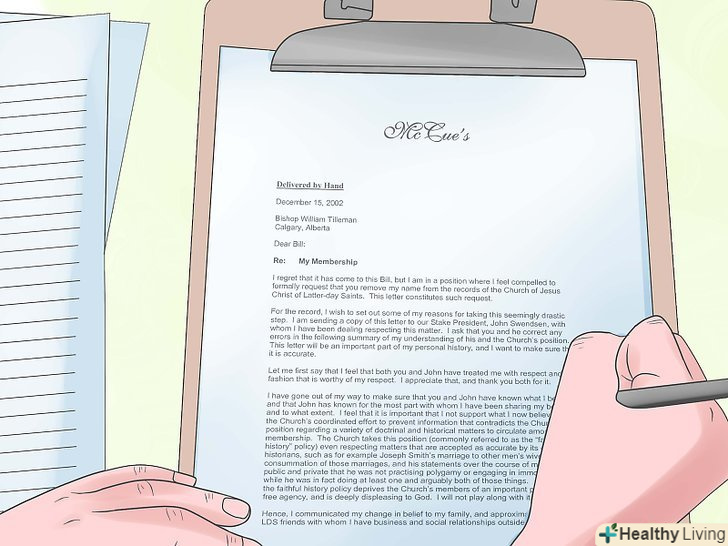 Знайдіть собі цікаве заняття в ті дні, в які ви зазвичай ходили до церкви. діліться з людьми своїми переживаннями, коли Вам сумно або ви відчуваєте провину. Задайте собі питання, чому ви себе так відчуваєте.- Якщо ви прийняли остаточне рішення, напишіть заяву до церкви. переконайтеся, що Ви вказали своє повне ім'я, дату народження, вашу поточну адресу та дату. Передайте цю заяву на адресу Вашої філії Церкви Ісуса Христа Святих Останніх Днів. Ось як може виглядати Заява: