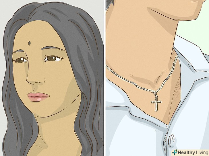Прийміть рішення, чи будете ви носити якісь релігійні символи. якщо так, то які. Може бути, ви захочете носити на шиї хрестик. Або, якщо ви жінка, ви можете продовжувати носити бінді (точку між очима). Якщо ви чоловік, ви можете розпустити білу індуїстську одяг, що охоплює ваш торс. А можете залишити її, як було раніше. Ці зміни можна зробити з плином часу. [20]