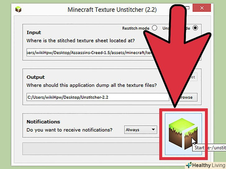 Розпір текстур пак. Текстур паки для Minecraft 1.5" зшиті " разом до тих пір, поки вони не використовуються, і пак повинен бути розпорот до того, як його конвертувати. Ви зможете зробити це вручну, але на це йде певний час. Замість цього скачайте програму Unstitcher, яка створена для автоматизації даного процесу. [2]- Запустіть Unstitcher, а потім завантажте текстур пак. Почнеться процес Розпірки, на який піде кілька хвилин.