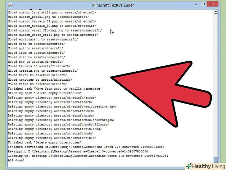 Конвертуйте розпоротий пак.як тільки процес Розпірки буде закінчений, скачайте і запустіть Minecraft Texture Ender. Дана програма конвертує розпороті текстур паки в ресурс пак. Запустіть програму і завантажте розпоротий пак, щоб почати процес конвертації.