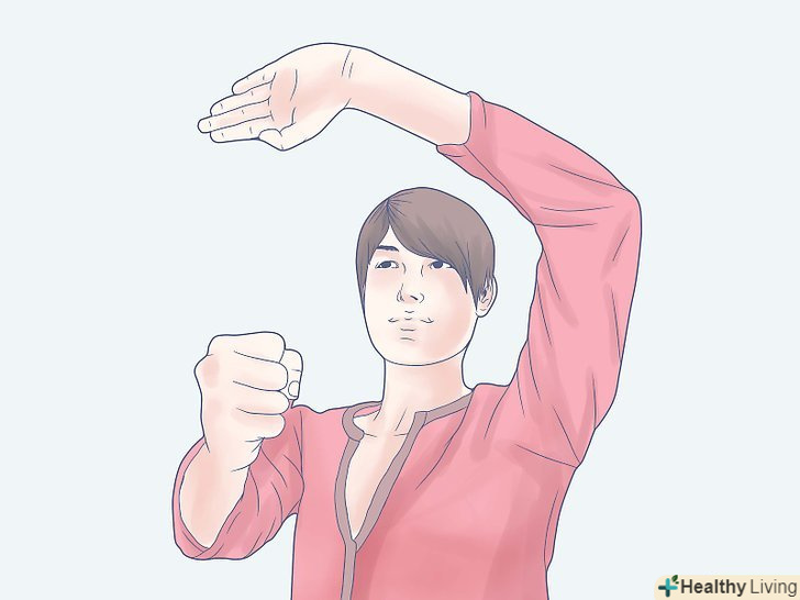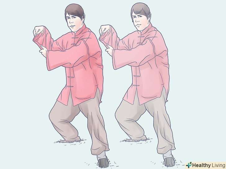 Виконайте рух "Білий журавель виблискує крилами". для цього перемістіть вашу вагу на одну ногу, але обидві повинні стояти на землі. Коли ви будете намагатися знайти рівновагу, вас може хитати вперед і назад. З руками все навпаки: одна повинна робити швидкі рухи в різних напрямках, інша – рухатися повільно і розмірено (але ні в якому разі не слабо і мляво).- Назва руху звучить м'яко, але у нього насправді бойове призначення. Зверніть увагу: ваша вага і положення рук постійно змінюються, але коли 100% вашої маси знаходяться на одній нозі, інший ви сміливо можете завдати удару. В цьому і є призначення.