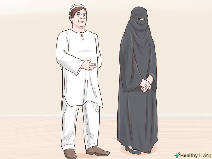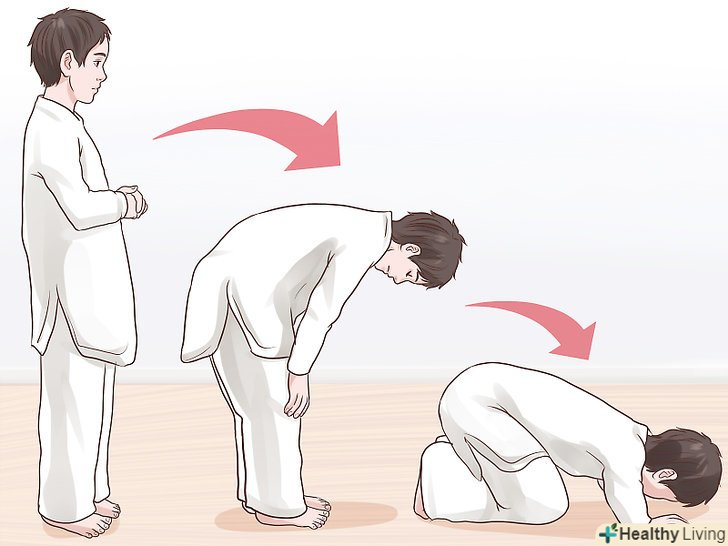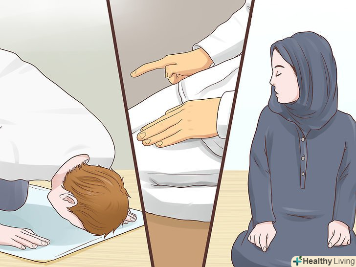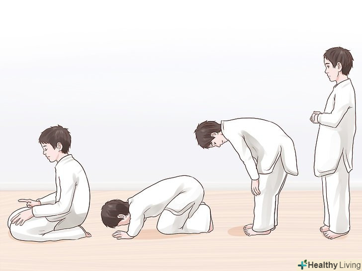 - Поклоніться. Зігніться в попереку і покладіть долоні на коліна. Тримайте спину прямо і вимовляєте молитву про себе (наприклад, «Субхана Раббіяль–Азим» або «Хвала моєму Великому Господу»). [15]