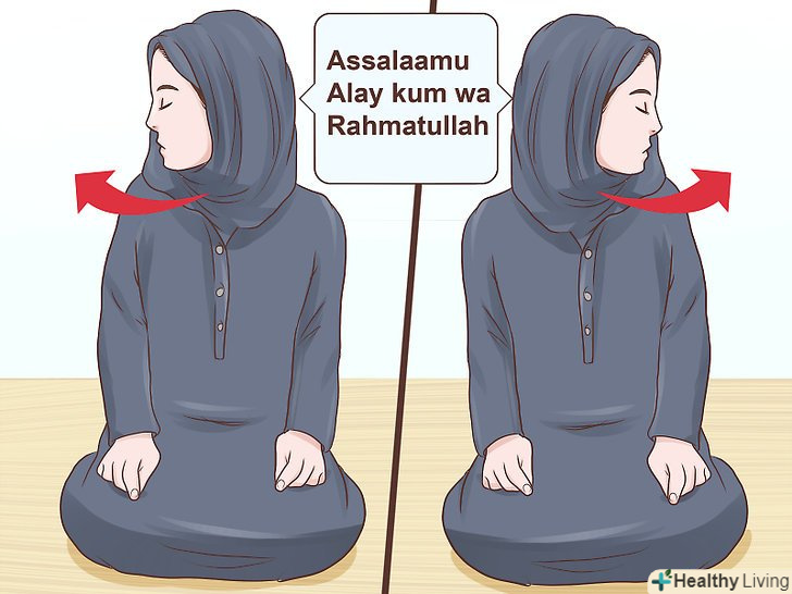 Навчіться читати ташаххуд. Покладіть руки на стегна поруч з колінами. [16] Стисніть праву долоню в кулак і доторкніться великим пальцем до середнього, сформувавши коло. Можна при цьому направити вказівний палець на каблах. Потім скажіть слова ташаххуда. [17] увіруйте в істинність Аллаха і його слуги Мухаммеда. [18]