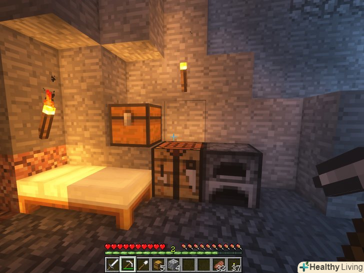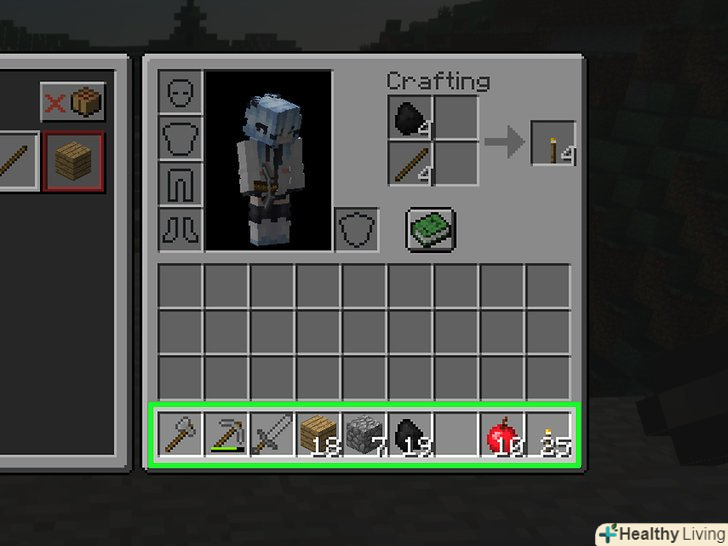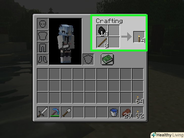 Зробіть факели.покладіть на верстак вугілля, а під нього — палицю. Факелів наробіть стільки, скільки вийде: ви зможете прикріплювати їх до твердих блоків. Факели-постійне джерело світла. Не виходьте з дому без них!
