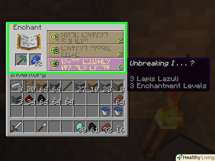 Зачаруйте кирку.припустимо, у вас Алмазна кирка, фортеця розміром з Москву і стільки руди, що олігархи плачуть від заздрості. Значить, поки почати грати по-дорослому! Зачаруйте свою кирку, щоб та копала ще краще. Ось список чар, доступних для знарядь праці:[10]- Чари Fortune (3 — й рівень-максимум) збільшують кількість видобутої з одного блоку руди. Копати такий киркою варто лише най-най цінні руди. Врахуйте, що чари Fortune і Silk Touch не можна помістити на один і той же предмет.