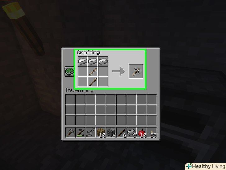 Зробіть собі кирку .якщо раніше ви ніколи і нічого не "майнили", то для початку вам потрібна кирка. Ось як зробити кирку, якою можна копати через камінь і менш цінні блоки:- Зробіть дерев'яну кирку (верхній ряд верстата — дошки, в дві клітини середньої колонки покладіть по палиці).