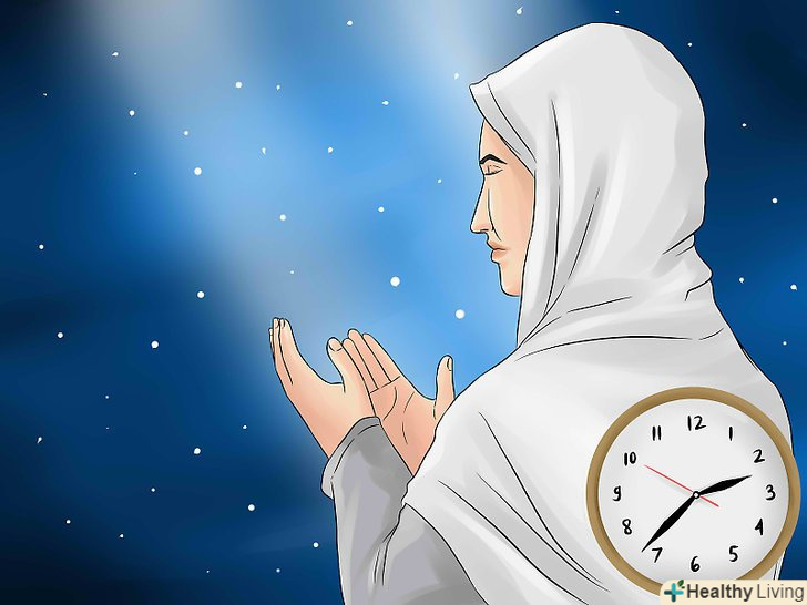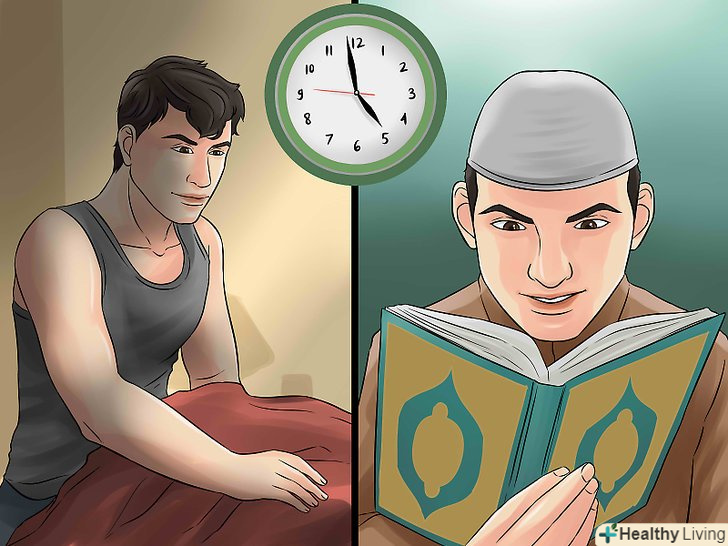 Дотримуйтесь традиційного розкладу Рамадану. щодня прокидайтеся перед початком Фаджра (ранкової молитви), щоб взяти участь у досвітній трапезі (сухур). При бажанні можна не лягати допізна і з'їсти сухур перед сном. Залишайтеся на ногах, щоб прочитати частину Корану до і після Фаджра. [4] Обов'язково дотримуйтесь строгий графік молитви і намагайтеся обертати свої повсякденні думки навколо святих речей. Утримуйтеся від їжі, пиття, куріння і сексу від світанку до заходу сонця, поки Рамадан не підійде до кінця. Із заходом сонця проведіть іфтар (розговіння, вечірній прийом їжі) з друзями і сім'єю і обговоріть, що ви дізналися за день.- Пошукайте час щоденної молитви у Вашому місті на сайті http://www.time-namaz.ru/ . Час молитви визначається Сходом і заходом сонця. Якщо ви живете в переважно мусульманському середовищі, можливо, ви будете кожен раз чути молитовні заклики протягом дня.