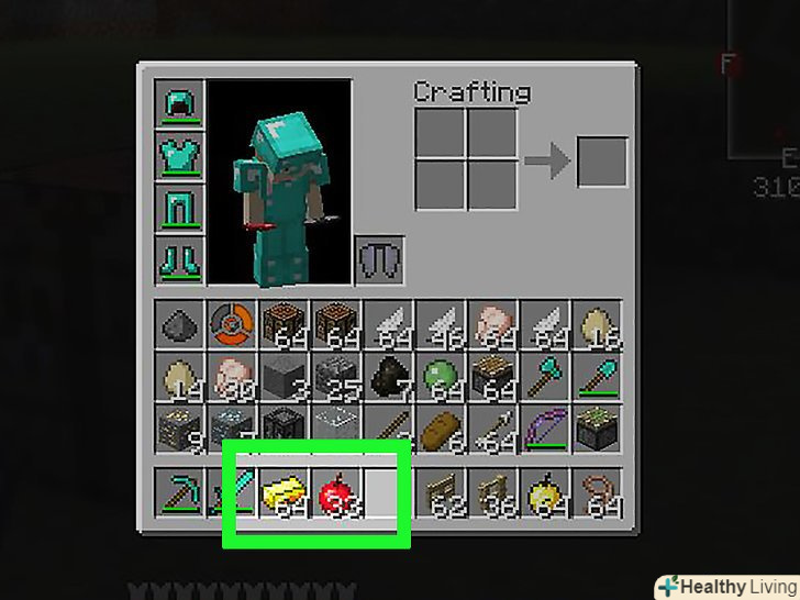 Скрафтіть два золотих яблука. Цей процес залежить від вашого пристрою:- Комп'ютер - відкрийте верстак, натисніть на стек золотих злитків, двічі клацніть правою кнопкою миші по кожній комірці верстата (крім центральної), додайте два яблука в центральну комірку, а потім перенесіть два золотих яблука на панель швидкого доступу.