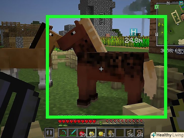 Виберіть коня.для цього клацніть по коні правою кнопкою миші або лівим тригером. Ви сядете на коня.- В Minecraft PE встаньте перед конем і торкніться "сісти" в нижній частині екрана.