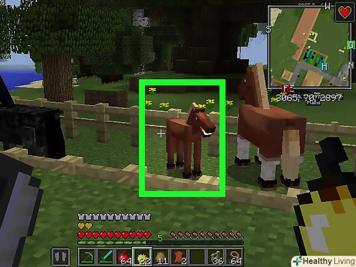 Приборкайте другого коня. Щоб розводити коней, знадобляться дві приручені коні.- Якщо перша приручена кінь не слідує за вами, побудуйте навколо неї стіну висотою в два блоки, щоб вона не втекла.
