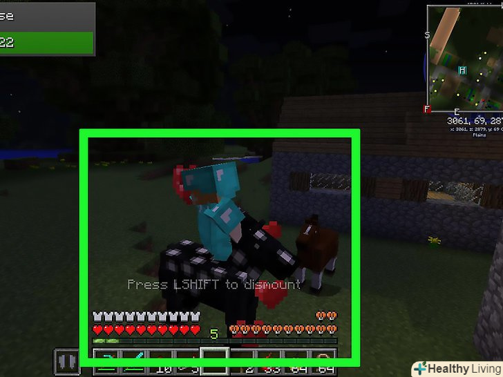 Дочекайтеся, коли на екрані з'являться Червоні серця.коли навколо коня відобразяться Червоні серця, вважайте, що приручили її. Тепер злізьте з коня-для цього натисніть лівий Shift або кнопку присідання.- Якщо Кінь вас відштовхне, ще раз сядьте на неї і дочекайтеся, коли з'являться Червоні серця. Можливо, вам доведеться зробити це кілька разів.
