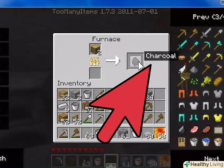 - Щоб зробити 64 факела, зберіть 19 блоків дерева. Зробіть дошки з 1 блоку. Вийде 4 дошки і залишиться ще 18 блоків. Поставте 2 блоки в піч, а 2 дошки поставте в нижній слот. Зачекайте, поки 2 блоки дерева перетворяться на деревне вугілля, а потім поставте їх у нижній слот. Тепер у вас Залишилося 16 блоків дерева і 2 блоки вугілля, використовуйте деревне вугілля, щоб спалити решту дерева. У вас буде 16 блоків деревного вугілля, покладіть їх на верстак разом з 16 палицями, і отримаєте факели.