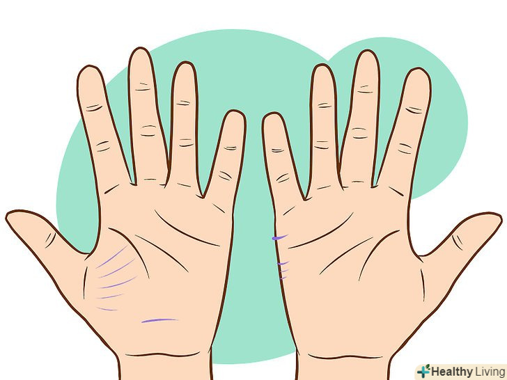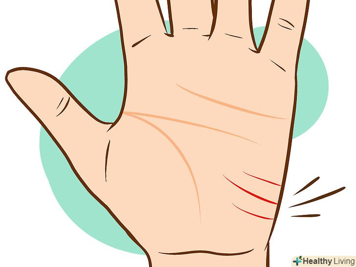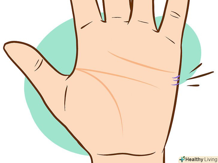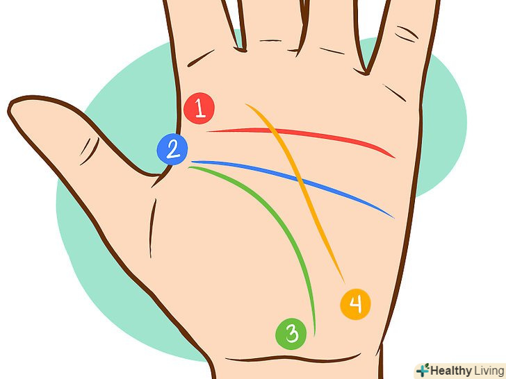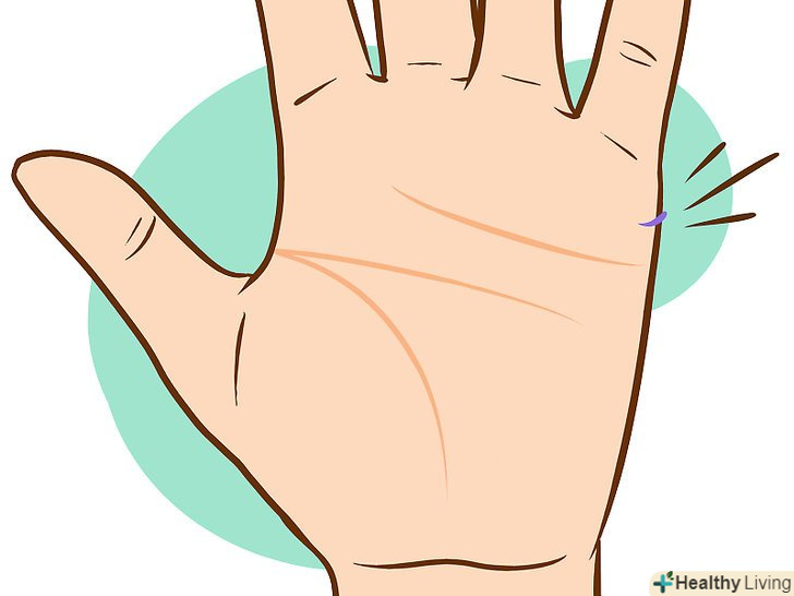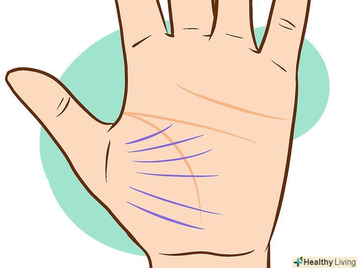 Знайдіть інші важливі лінії на долоні. крім ключових чотирьох ліній, є й інші важливі лінії, на які варто звернути увагу: лінія здоров'я, лінія слави, лінія шлюбу, лінія грошей і лінія подорожей.- Лінія здоров'я починається під мізинцем і проходить до основи великого пальця через долоню. [8]