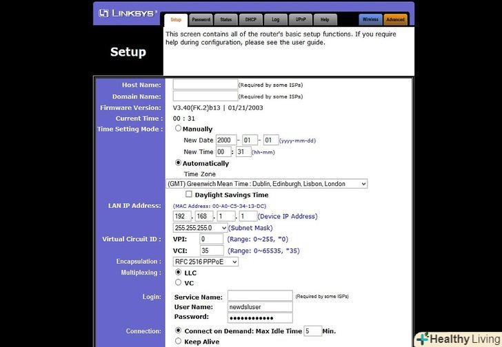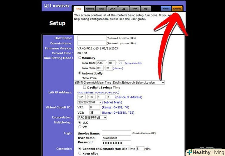 Налаштуйте ваш роутер.вам потрібно буде налаштувати роутер, щоб він з'єднувався через динамічний DNS. Знаходження цих налаштувань відрізняється від роутера до роутера, але, як правило, вони знаходяться під «Advanced settings».- Вам потрібно буде вводити ваше ім'я хоста, ім'я користувача та пароль.