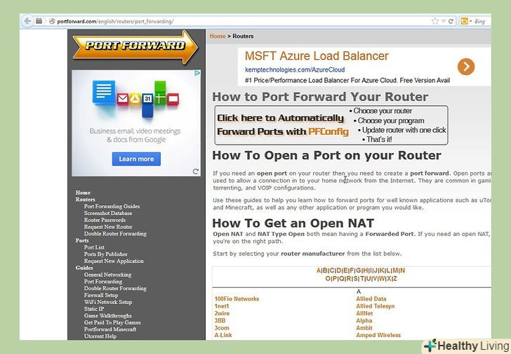 Зайдіть в меню конфігурацій вашого роутера. кожен роутер має свій власний спосіб, щоб заходити в Налаштування. У більшість роутерів можна зайти через Інтернет браузер, ввівши IP адреса, який, як правило, це 192.168.1.1 або 192.168.2.1.- Якщо ви не можете зайти на ваш роутер жодним з перерахованих вище IP адрес, зайдіть на PortFoward.org і введіть інформацію вашого роутера. Керівництва, за замовчуванням, видадуть список стандартних адрес, які використовує ваш роутер.