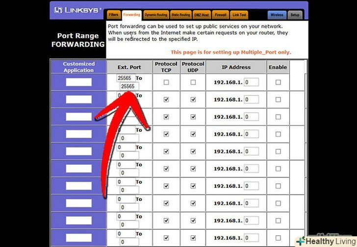 Введіть інформацію порту. за замовчуванням, порт Майнкрафт сервера це 25565. Якщо ваш роутер вимагає діапазон портів, тоді введіть 25565 в обидва "Start Port»і "End Port".- Настройте «Protocol» на «TCP».