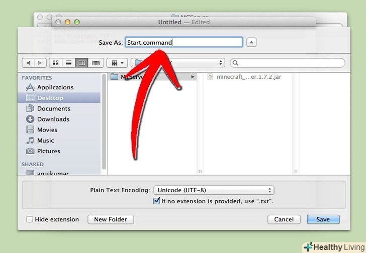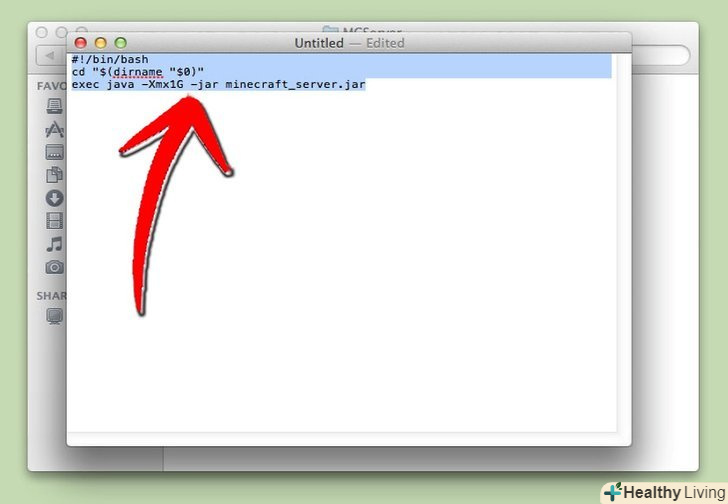 Відкрийте серверну папку.відкрийте папку, в якій знаходиться файл minecraft_server.jar. Створіть новий текстовий документ за допомогою TextEdit. Налаштуйте формат на "Make Plain Text". Скопіюйте наступні рядки у файл:#!/bin/bash