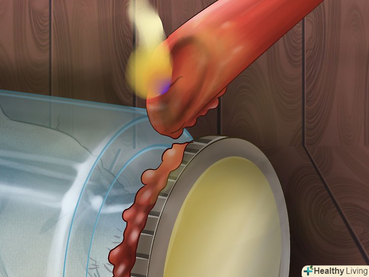 Запечатайте кришку воском (за бажанням). якщо у вас є червона або чорна свічка, можна запалити її і залити розплавленим воском краю кришки, щоб герметично закрити банку.- Щоб посилити прокляття, можна за допомогою шпильки або чогось гострого надряпати ім'я вашої жертви на свічці, перш ніж розтопити її.