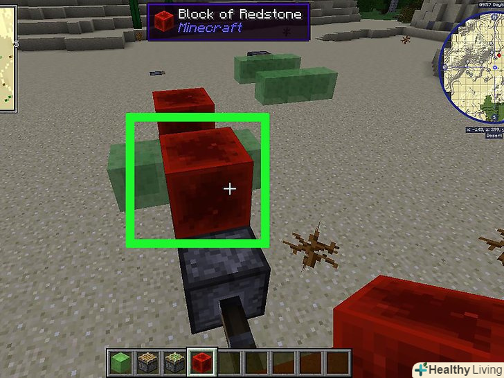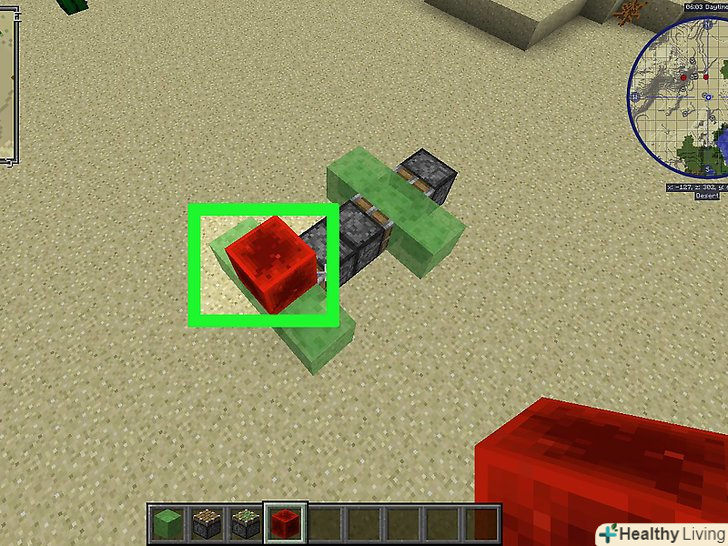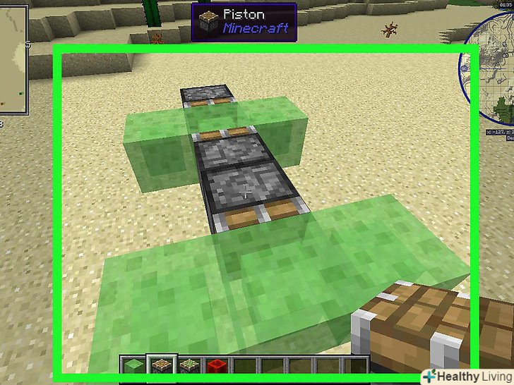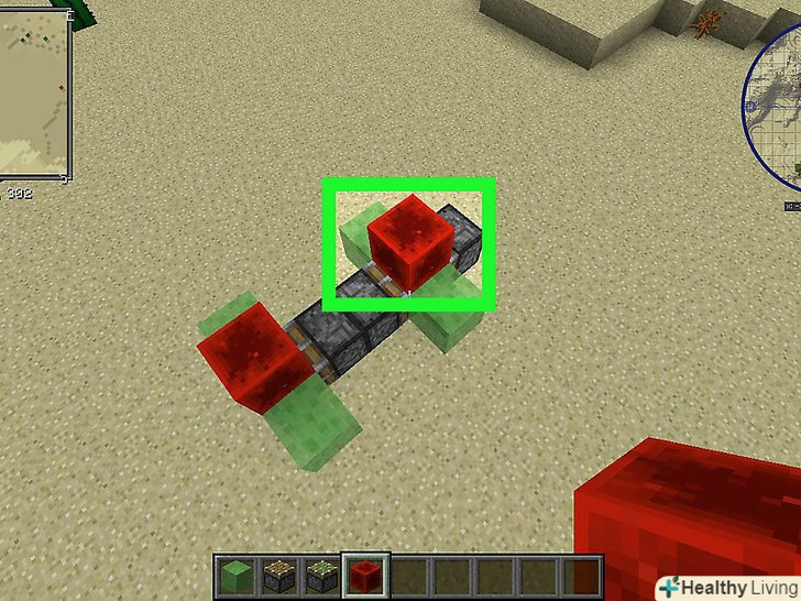 Поставте інші блоки червоного каменю.один блок поставте на центральний блок заднього ряду блоків слизу, а другий — безпосередньо перед першим над липким поршнем.