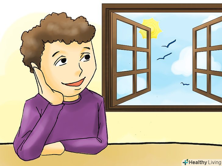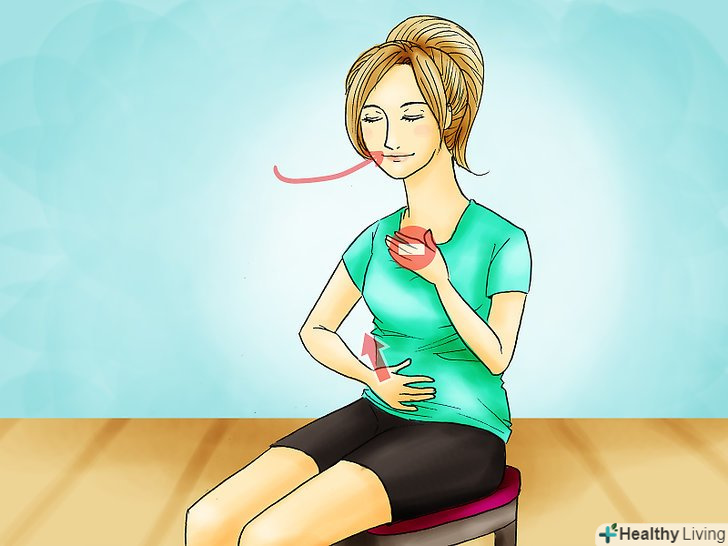 Спробуйте дихальні вправи. достатня кількість кисню підвищує фізичну енергію і розумову активність. А це, в свою чергу, подарує вам позитивні почуття. Спробуйте періодично практикувати одне з наступних дихальних вправ: [14]- Сядьте прямо. Покладіть одну руку на живіт, а іншу – на груди. Зробіть глибокий вдих через ніс. Ви повинні відчути, як піднімається рука на животі, а рука на грудях повинна залишитися нерухомою. Повільно видихайте, ледь відкривши рот. Руку, яка знаходиться на животі, можна використовувати, щоб виштовхнути повітря назовні. Повторіть цю вправу десять разів.