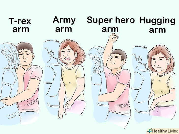 Правильно розташовуйте руку. це є ключовим моментом у створенні міцної пози для обіймів. Відповідальність за це зазвичай лягає на "велику ложку" тому, що саме її рука скоріш за все буде відчувати незручність. Погане розташування руки може привести до її оніміння або неможливості покинути позу. Нижче наведені деякі положення руки, які слід будь-якою ціною уникати:- Рука тиранозавра рекса (Т-рекса): з'являється, коли обидві ложки обіймаються, лежачи на боці, а нижня рука "великої ложки" виявляється притиснутою до спини "маленької ложки" (зігнутою в лікті) і її нікуди витягнути.