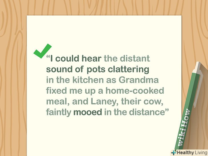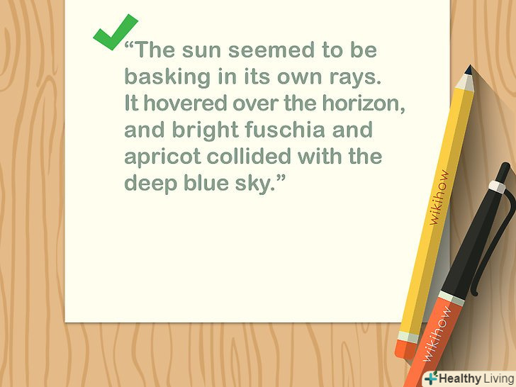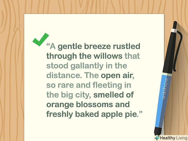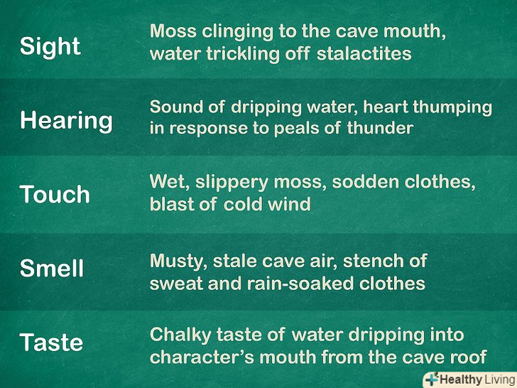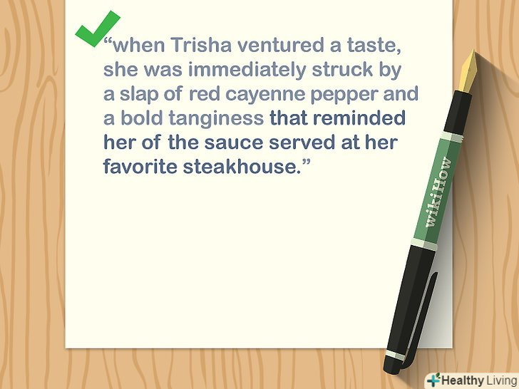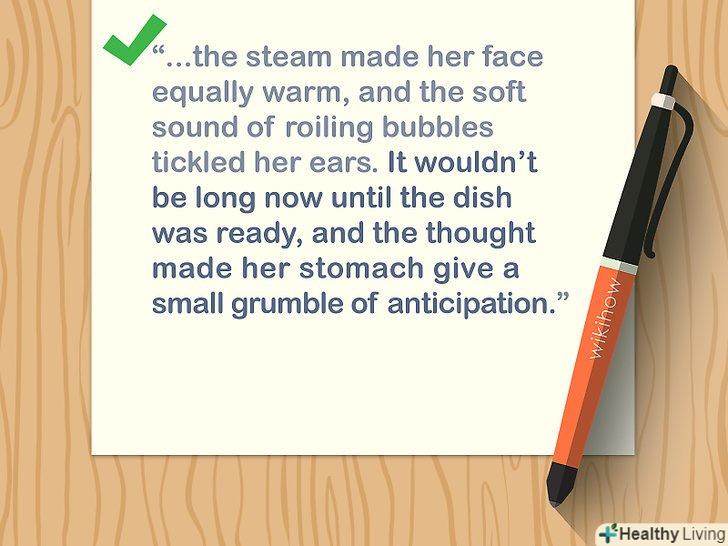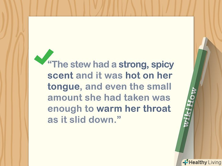 Використовуйте сенсорні деталі на зразок кольору, фактури і смаку.яскраві сенсорні деталі допоможуть читачеві уявити незнайомий об'єкт або побачити знайомий предмет в новому світлі. Короткі описи, що волають до дотику, нюху, почуття смаку або зору, дозволяють оживити будь-який об'єкт. Вкажіть вагу, температуру, міцність, запах або навіть смак предмета. Повна свобода творчості![7]Як задіяти сенсорні деталі